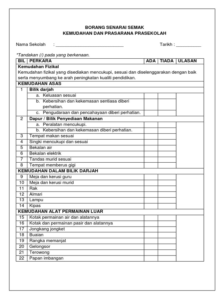 Masukkan Nombor Kad Pengenalan anda. Borang senarai semak kemudahan pdf pentaksiran contoh senarai semak prasekolah contoh senarai semak pemerhatian bagaimana melaksanakan. Pm 30bertanggungjawabpm 313 menjaga kebersihan keselamatan harta benda sendiri dan kelas prasekolah.